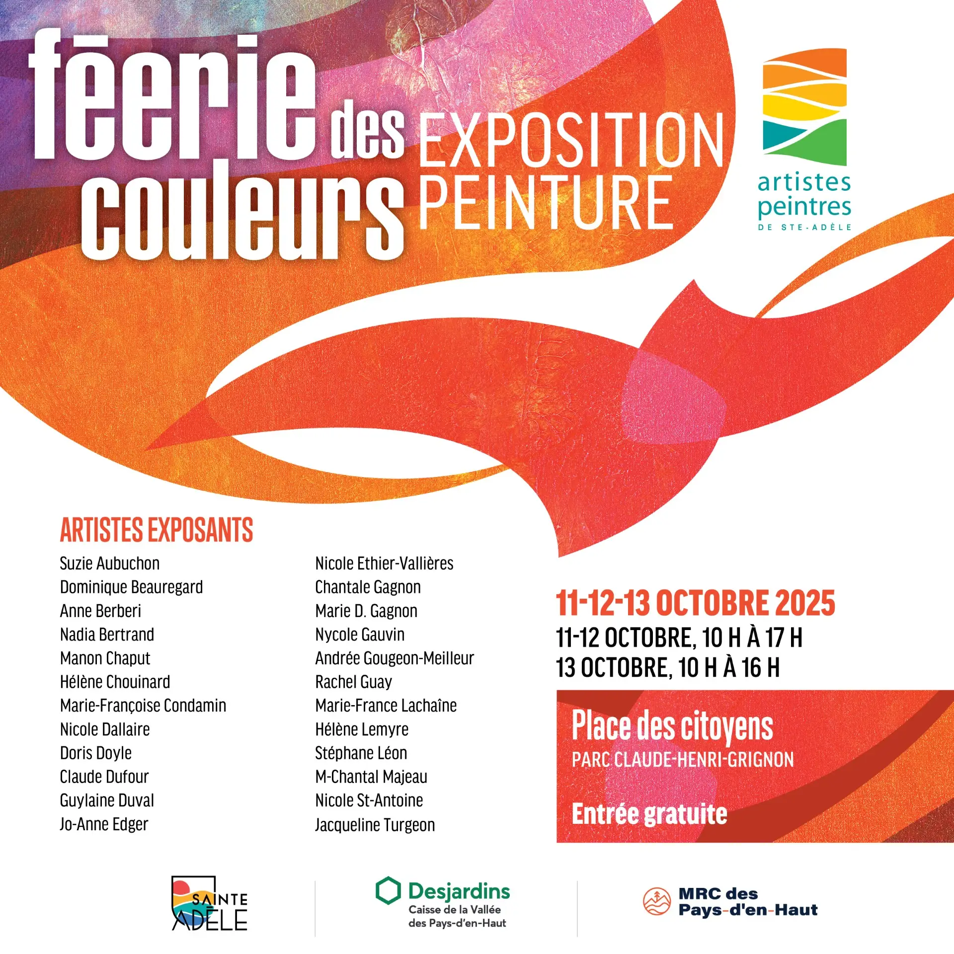 L’exposition de peinture « Féerie des couleurs », organisée par les artistes peintres de Sainte-Adèle, se tiendra les 11, 12 et 13 octobre 2025 à la