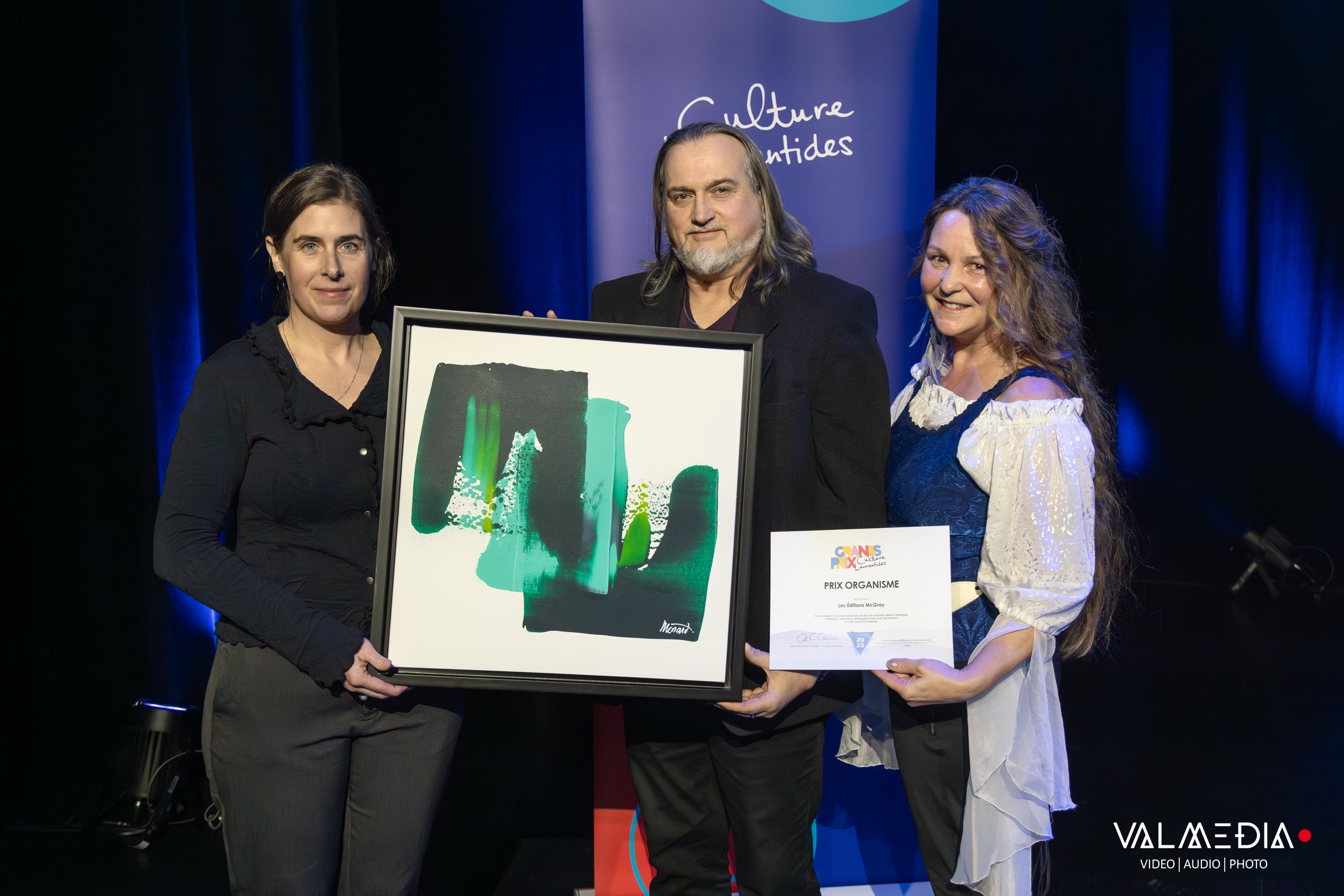Le prix Organisme a été remis à Les Éditions McGray. Pour la création d’un univers immersif porté par une production littéraire fantastique d’envergure, une mission pédagogique, un plan d’affaires structuré et pour son rayonnement à la fois local et international. Ils ont reçu une œuvre intitulée Songes de l’artiste Maryse Ménard.