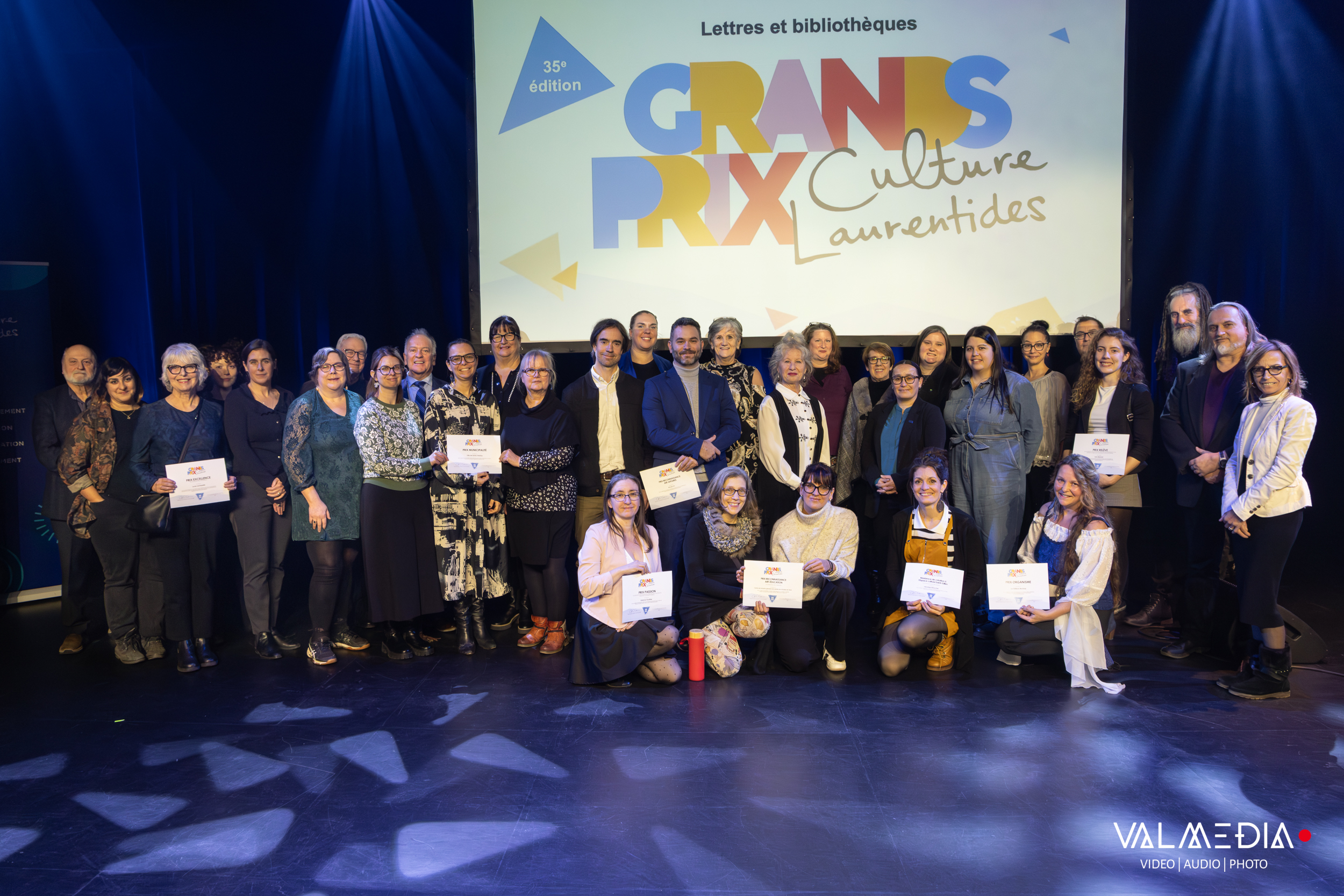 Sainte-Adèle, le 19 novembre 2025 – Culture Laurentides a tenu ses 35es Grands Prix de la culture des Laurentides le 18 novembre dernier au Théâtre Le Patriote à Sainte-Agathe-des-Monts. Plus d’une centaine de personnes étaient présentes à cet événement annuel, qui célébrait le talent et l’engagement dans le domaine des lettres et des bibliothèques dans notre région. Près de 20 000 $ en prix et en bourses ont été remis.