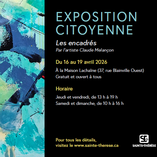 La Ville de Sainte-Thérèse a le plaisir de vous inviter à l’exposition Les encadrés de l’artiste Claude Melançon. Cette série d’œuvres, de facture abstraite, se veut une expérimentation spontanée de textures et de couleurs guidée par une quête de simplicité et d’espace. Le besoin d’alléger le contenu s’est fait rapidement sentir, ainsi que celui de rendre certaines parties plus saillantes par des traits les entourant. D’où le titre de l’exposition Les encadrés. De la même façon qu’un encadré est un texte mis en valeur dans une page par un filet qui l’entoure, les « encadrés » de cette exposition servent à faire ressortir certains éléments des toiles pour y attirer le regard.