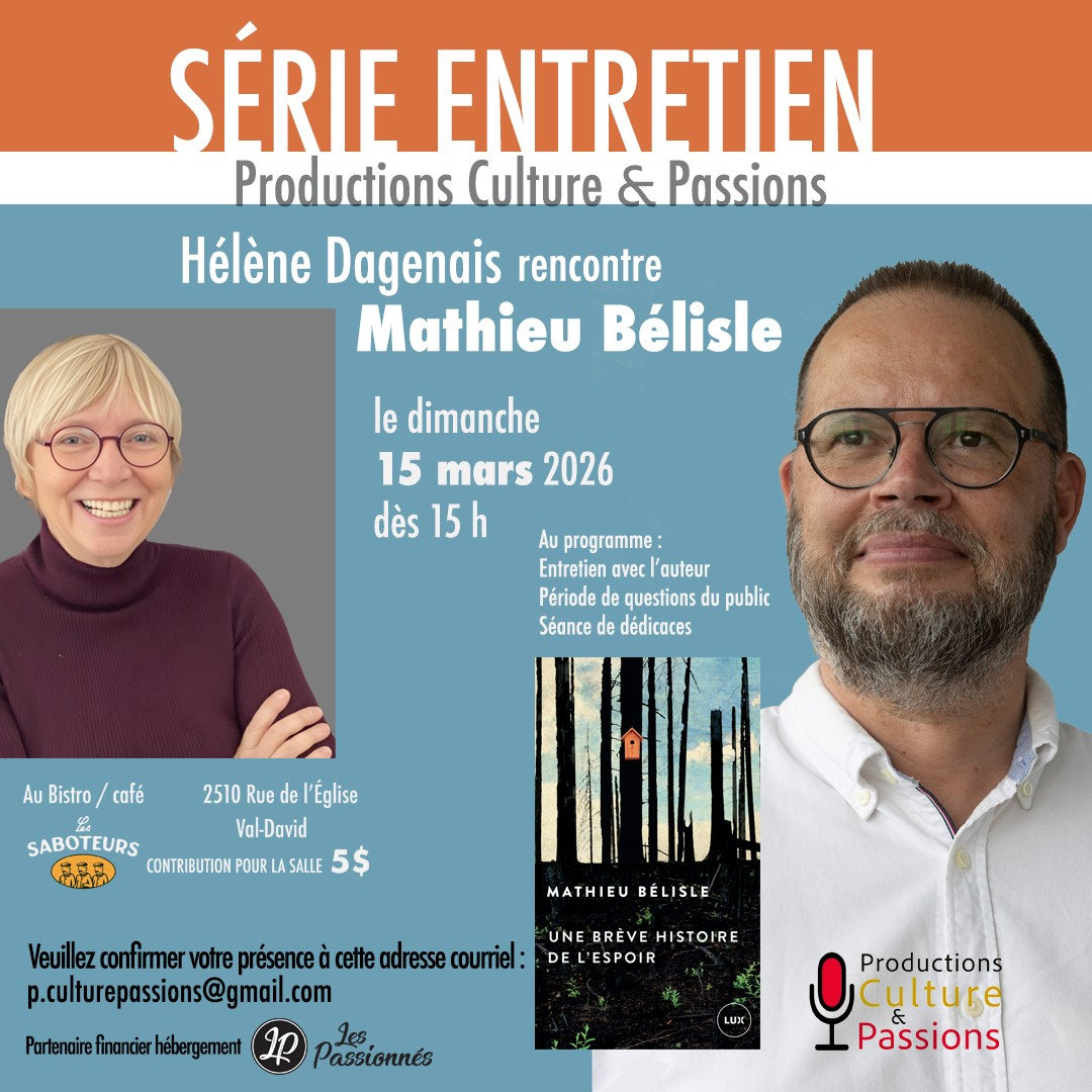 15mar15h000h00Productions Culture & Passions - Série entretien : Hélène Dagenais rencontre Mathieu BélisleLes Saboteurs - restaurant | caféCatégories:ConférenceMRC:MRC des Laurentides